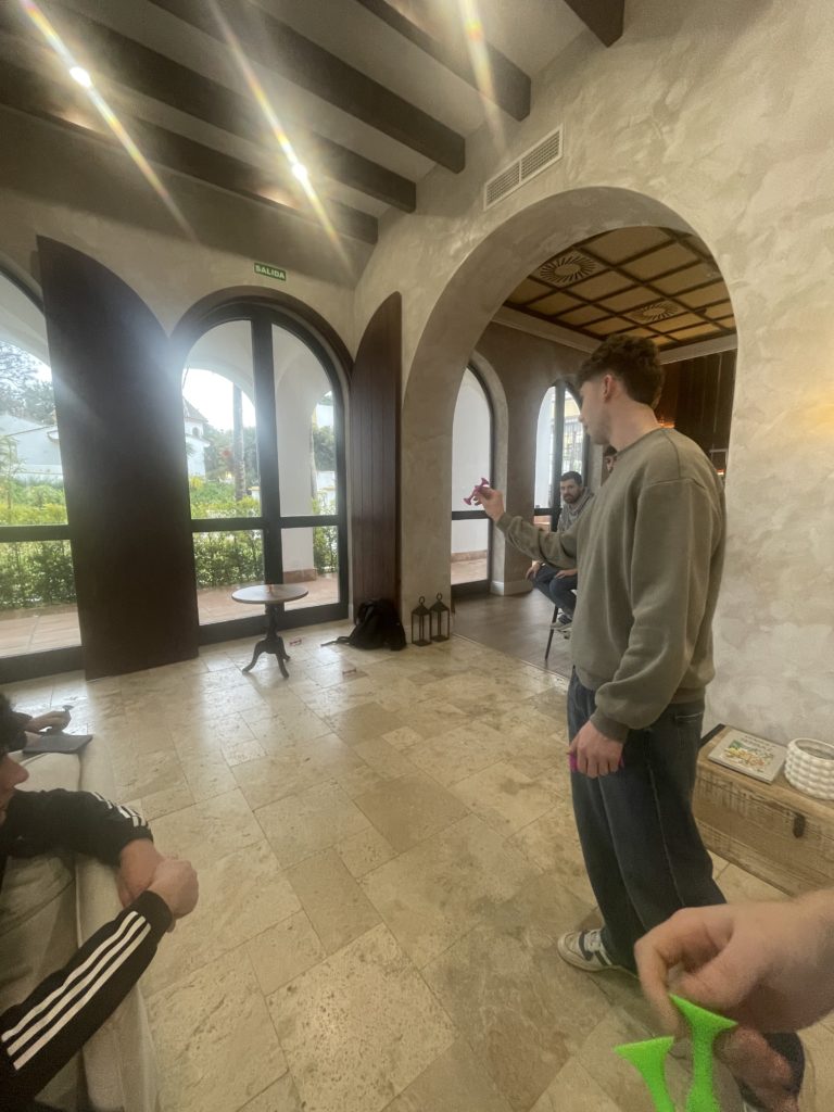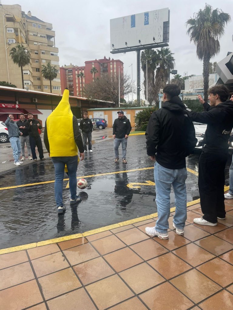 Der heutige Tag stand im Zeichen der Erholung – zumindest grösstenteils. Am Morgen wurde zunächst der Wanderpokal vergeben. Die „Ehre“ ging diesmal an Gian P., der am Vortag navigationstechnisch nicht ganz auf der Höhe war und sich damit den Titel redlich verdient hat. Der Pokal wechselte somit erneut den Besitzer. Zusätzlich wurde eine kleine Überraschung für unseren werdenden Vater und zugleich Verlobten Severin G. vorbereitet. Passend zu unserem Ausflugsziel erhielt er ein hübsches Bananenkostüm. Vor der Abfahrt in richtung Gibraltar wurde noch eine weitere Zimmerchallenge absolviert.