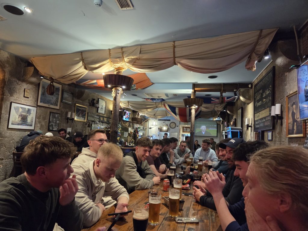 Den Abschluss des Tages bildete ein gemeinsames Abendessen in einem Irish Pub in der Stadt, wobei es einige während der Livemusik krachen liessen. Unter anderem war es Claudio B., der den Rahmen wortwörtlich sprengte. Ein Teil der Innenausstattung in der Toilettenanlage des besagten Pubs musste etwas leiden. Dank dem handwerklichen Geschick des Übeltäters konnte der Schaden jedoch innert kürzester Zeit wieder behoben werden.